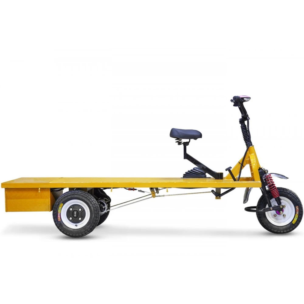 Тележка предназначена для перевозки грузов до 300 кг. Предназначена и выгодна в помещениях с небольшой квадратурой и узкими коридорами, стройках, частном секторе, базах отдыха, аэропортах, железнодорожных вокзалах. Модель оснащена бесщеточным электродвигателем мощностью 800 Вт, который способен развивать скорость до 25 км/час.