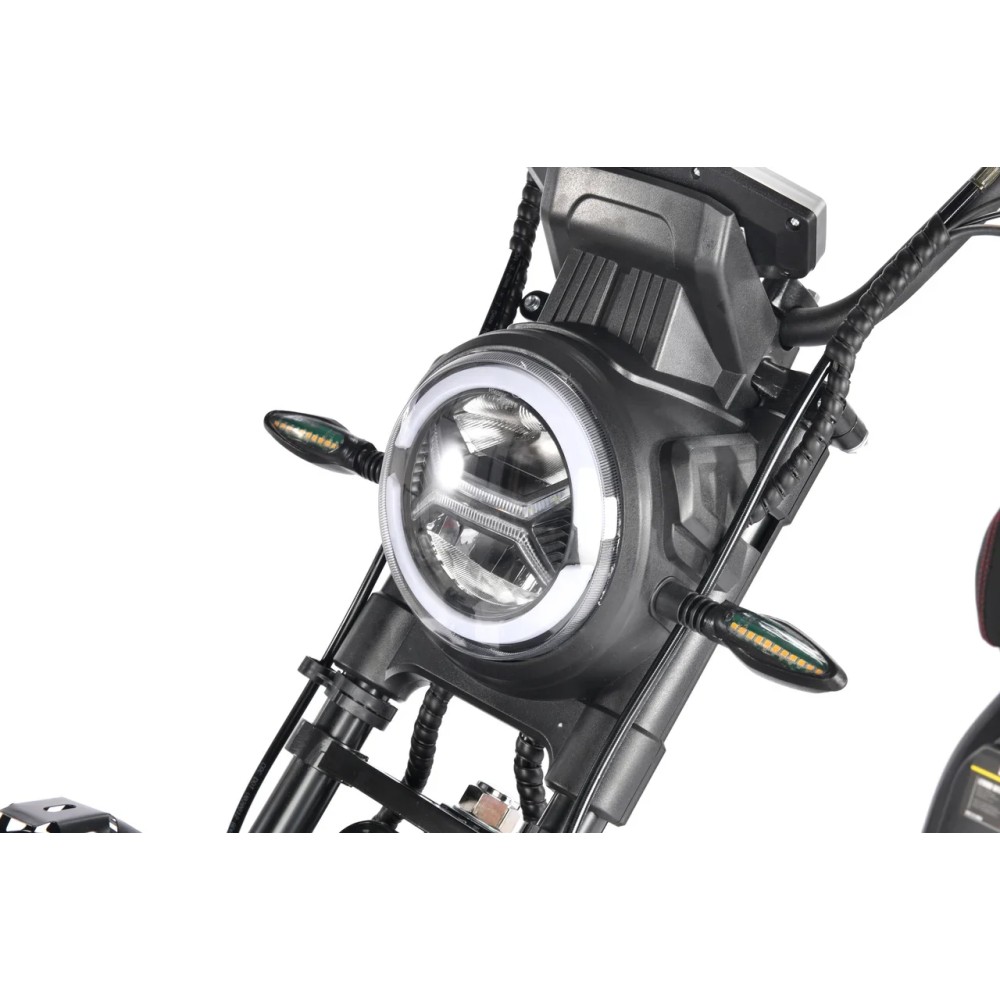 Технические характеристики черного электроскутера представлены такими параметрами: мощность – 2500 Вт, емкость литий-ионного АКБ - 1260 Wh, максимальная скорость – 50 км/час, максимальная продолжительность движения на одной подзарядке. Комфортное двухместное сиденье не утомляет, не вызывает перенапряжение позвоночного столба. Из других преимущественных характеристик стоит выделить прорезиненные ручки, наличие переднего и заднего тормоза, делающими движение безопасным для ездока и техники. При покупке электроскутера клиенты могут рассчитывать на гарантию производителя.