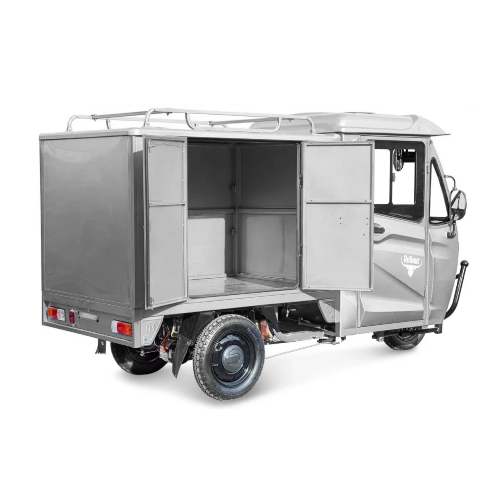 Серый электротрицикл Rutrike КАРГО Кабина Дуал способен выдержать максимальную нагрузку до 750 кг. Закрытый грузовой отсек с боковыми дверями обеспечивает надежную защиту груза от внешних воздействий и обеспечивает конфиденциальность перевозки.
